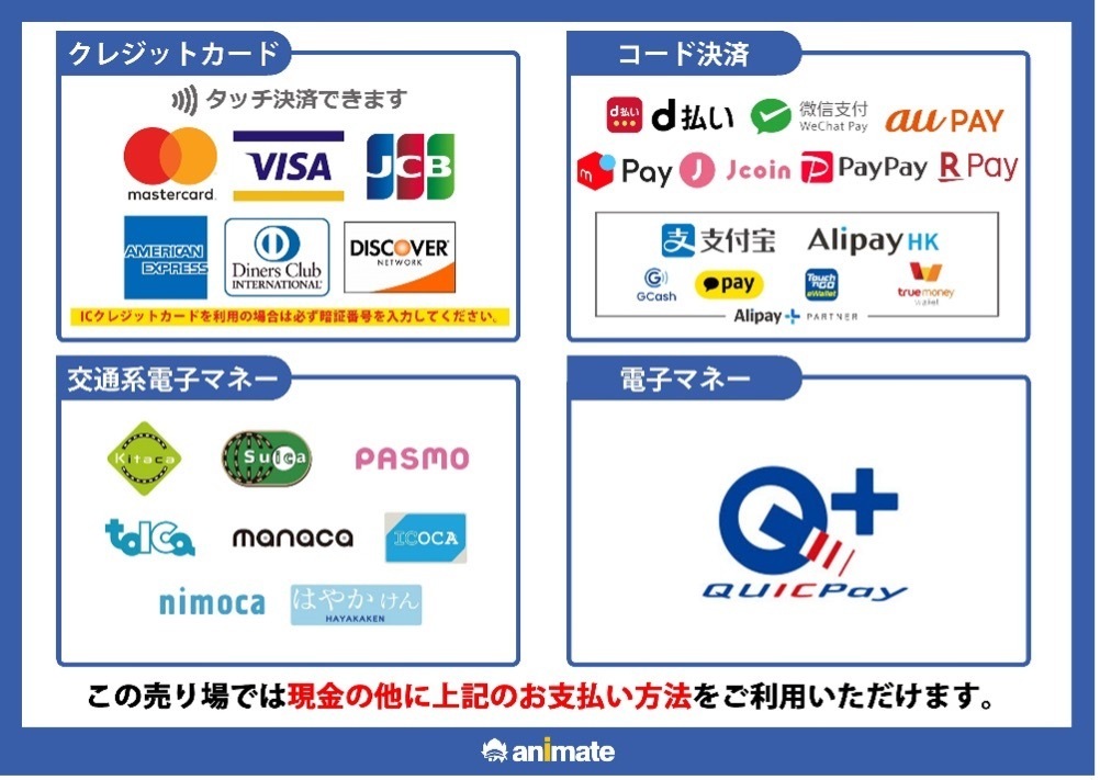 ・電子マネー(QR決済):PayPay、d払い、Wechat Pay、au PAY、メルペイ、J-Coin